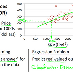 Supervised Learning 감독학습이란, 과거의 평가된 데이터(Training Data)로부터 하나의 함수를 유추해내기 위한 방법입니다. 1. Classification : 분류 - 단절된 요소를 나누는 것 (discrete value) - 이메일이 도착했을 때 스펨 메일인지 아닌지 구분, 환자의 종양 크기에 따라 악성 종양인지, 아닌지 판단하는 것 2. Regression : 회귀 (추상, 트렌드, 경향) - Regression은 continuous value 를 예측하는 것입니다. - 집의 평수에 따라 가격을 예측, 수 많은 제품들을 3달 안에 판매할 수 있는지 예측 Unsupervised Learning 자율학습이란, 대상에 대한 어떤 정보도 주어지지 않은 상태(labeling 되지 않은 ..